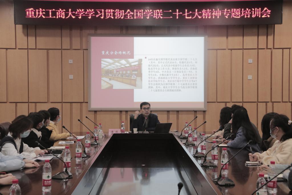12月11日下午,我校于南岸校区图书馆第五会议室召开《学习贯彻全国学联二十七大精神》专题培训会。本次会议特邀请到团市委高校工作部潘毅部长担任主讲人,校团委副书记胡婧婷和和校院两级学生会成员参加会议。