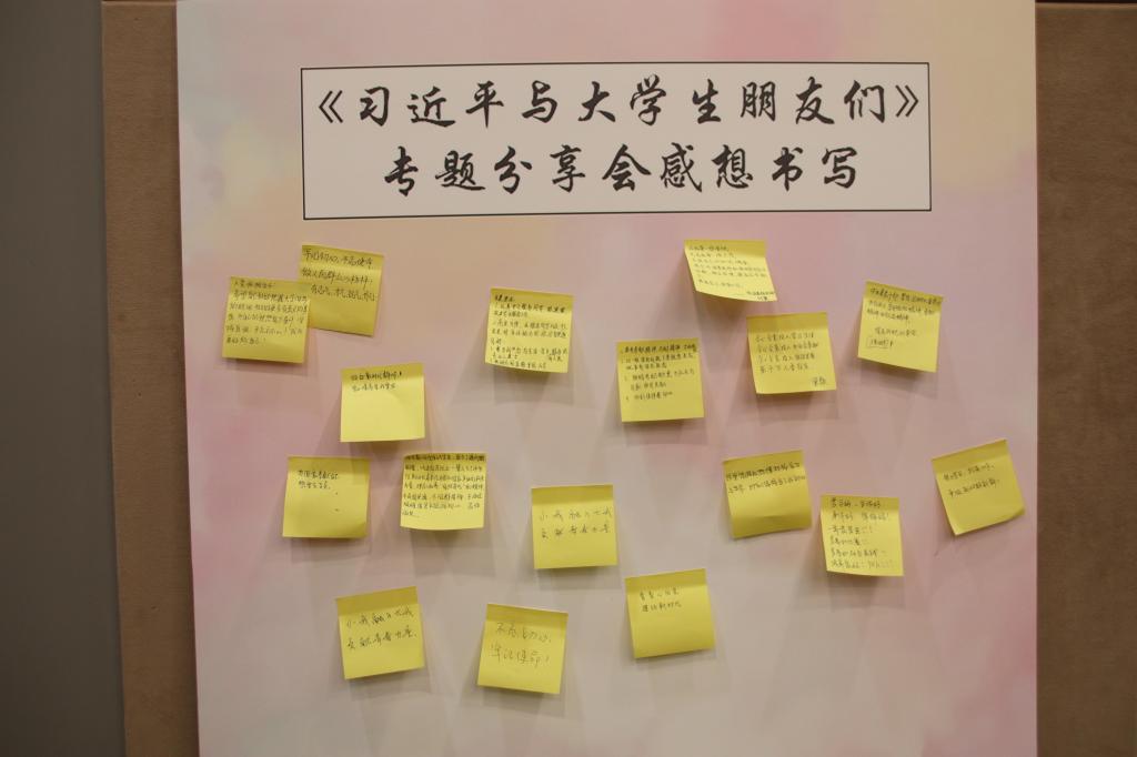 会议伊始,夏梓瑞宣读并介绍《习近平与大学生朋友们》基本内容。校学生会部门负责人王欢领学《习近平与大学生朋友们》(二)——习总书记与我们聊如何做好基层工作,她介绍道:“干好基层工作,要有兴趣,有热情,要有韧性,要有耐力,要有一点儿组织能力,要有一股豁出去的干劲。”;校学生会部门负责人张瑞领学《习近平与大学生朋友们》(八)——习总书记来到学生社团活动中心,他提到:“当代大学生要有乐观开朗的心态,不怕艰辛,走进党员活动室,开展活动,认识朋友,弘扬优秀文化,推动精神文明建设。”在学习内容观众答问环节,各参会人员积极分享自身在学习后的感想与心得体会,部分参会人员表示;“作为当代大学生,要德才兼备、厚德载物,重视自身全面发展,敢于负责,大胆创新,激发接续奋斗的历史使命和责任担当。”最后,校团委(学生)副书记王天鹏表示:“作为学生干部,需时刻不忘初心,牢记使命,长知识、增才干。”同时,各参会人员在留言板上写下自己对未来发展的要求和目标,时刻鼓舞自己。