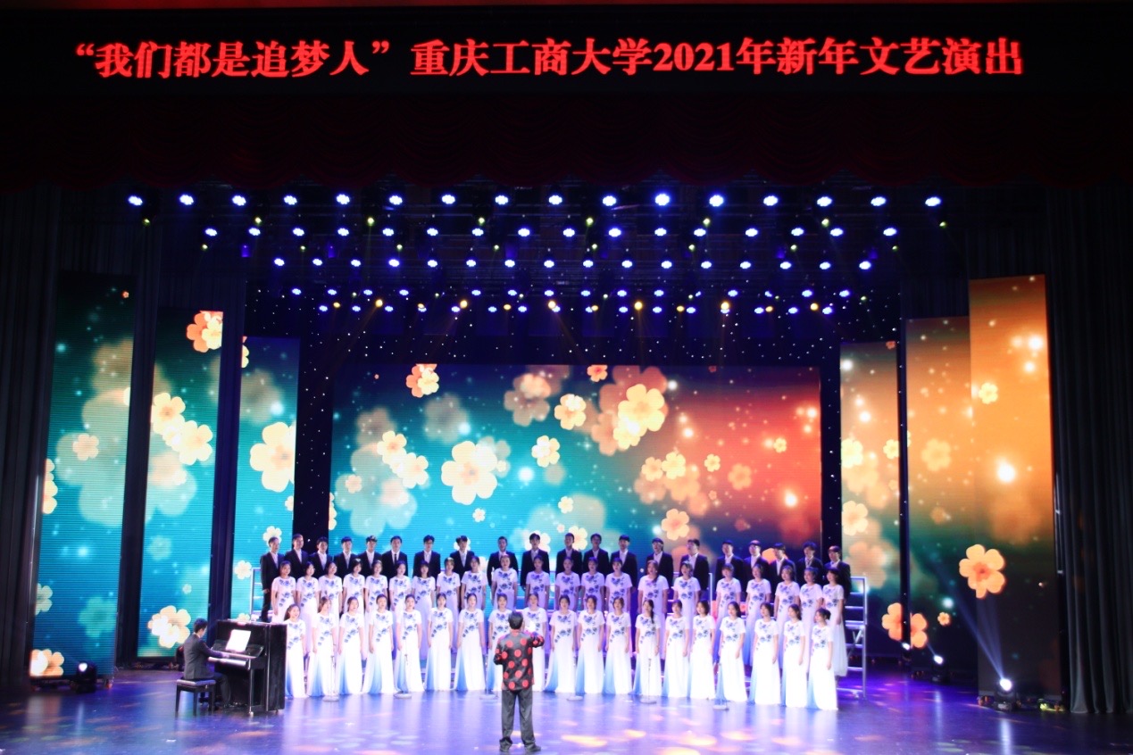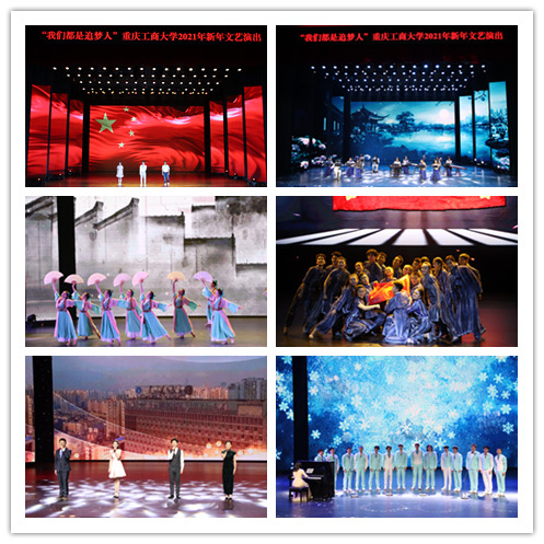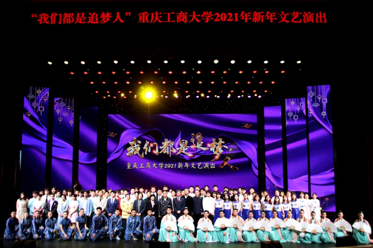 12月23日晚,“我们都是追梦人”重庆工商大学2021年新年文艺演出在南岸校区剧场隆重举行。校党委书记李志雄,校党委副书记、校长孙芳城,校党委副书记宋豫,党委常委、副校长李国军,党委常委、组织部部长郑夕春,党委常委、宣传部部长华杰,相关职能部门负责人、各学院领导、教师代表、学生代表及校友代表等莅临现场,喜迎新年。