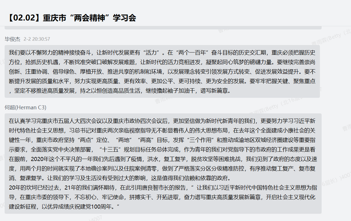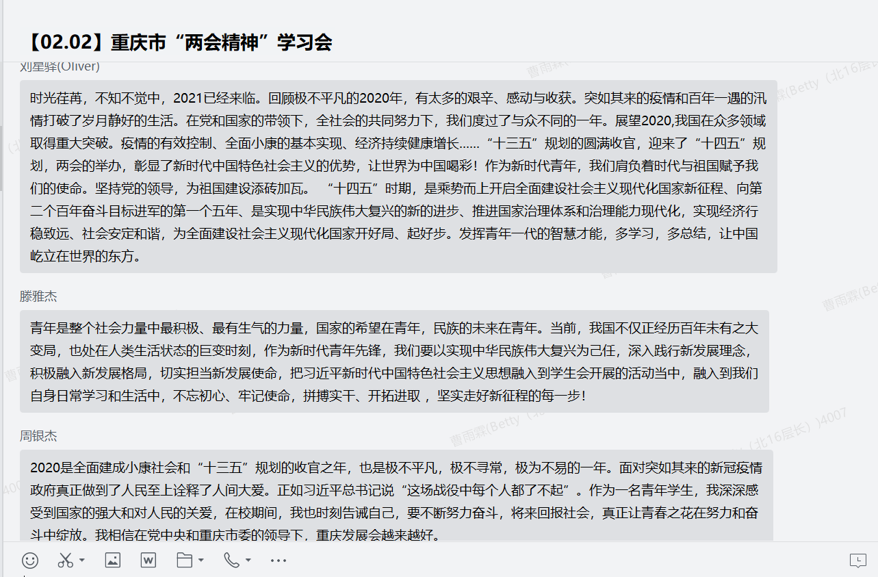为进一步贯彻落实重庆市两会精神,展现新青年良好风貌,我校校院学生会于2月2日晚上通过企业微信平台召开重庆市两会精神的线上主题学习会。本次线上主题学习会由校学生会主席团成员夏梓瑞主持,20余名校级学委会成员线上共同参与。
