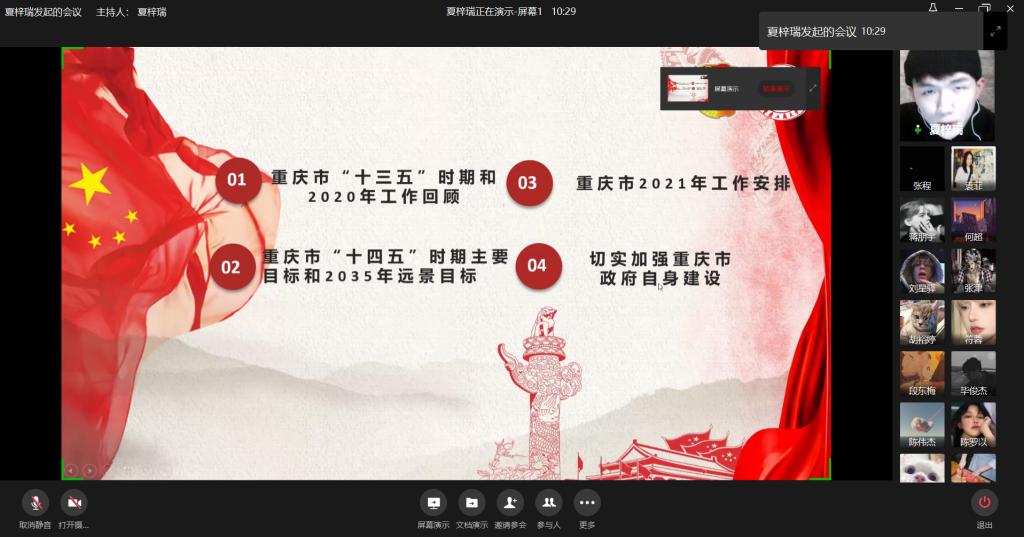 会议伊始,夏梓瑞带领与会成员回顾了我市“十三五”时期和2020年的工作,并引用“五个最”和“四个持续”简明扼要地对上述内容进行概括。夏梓瑞带领大家细致了解“十四五”时期主要目标任务和2035年远景目标。通过主要任务与目标,学委会成员清楚地了解到其对于重庆市来说的指导意义与重要性所在。随后,夏梓瑞向学委会成员介绍两会提出的对于我市2021年的工作安排,并分享了我市将会切实加强政府自身建设的愿景,让学委会成员对我市的未来规划有更加深刻的了解。最后,学委会成员积极发表自己学习两会精神后的感悟,表达自身对于两会精神的认可与赞扬,并对重庆未来的发展表达美好祝愿。其中,陈伟杰说到:“重庆市“两会”的召开在特殊时期给全市骨干群众服下了一颗强心剂,而作为青年大学生骨干,应把“十四五”规划以及2035年远景目标融入个人的学习与工作中。”符蓉表示:“作为新时代的接班人,我们要学习习近平新时代中国特色社会主义思想,贯彻落实两会精神,强化责任感和使命感,为中华民族的伟大复兴贡献自己的一份力量。”