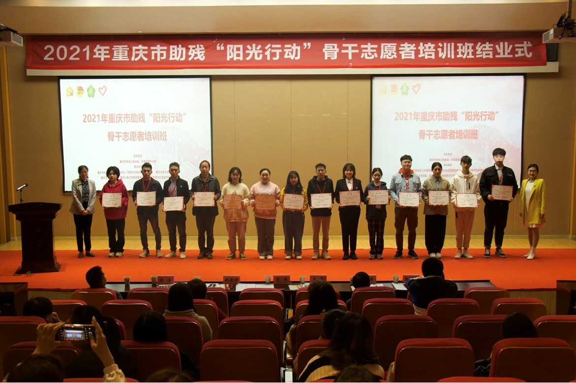 10月30日上午,重庆市残疾人联合会、共青团重庆市委主办的2021年重庆市助残“阳光行动”骨干志愿者培训班于重庆工商大学田家炳书院顺利结业。重庆市残联组联协会部主任李霞,市志愿服务工作指导中心党支部副书记贺伟,市青社联主席、重庆城市管理职业学院社会工作研究中心副主任齐芳,市青社联副主席、重庆仁爱社会工作服务中心理事长郭小建,重庆工商大学团委副书记胡婧婷出席结业仪式。