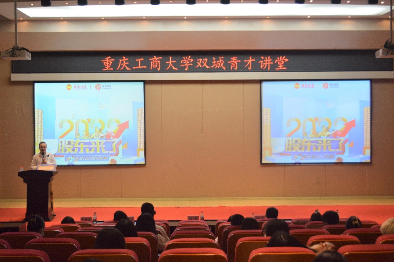 重庆市证券期货业协会秘书长王跃详细介绍了《股东来了》投资者权益知识竞赛,回顾了往届赛事开展情况,讲解了本届赛事的新特点及参赛方式等,鼓励同学们以赛促学、学赛结合,增加知识储备,提升专业技能。此外,他还分享了重庆市证券期货业协会发展情况和主要职责,为学生求职就业和实习实践提出针对性建议。