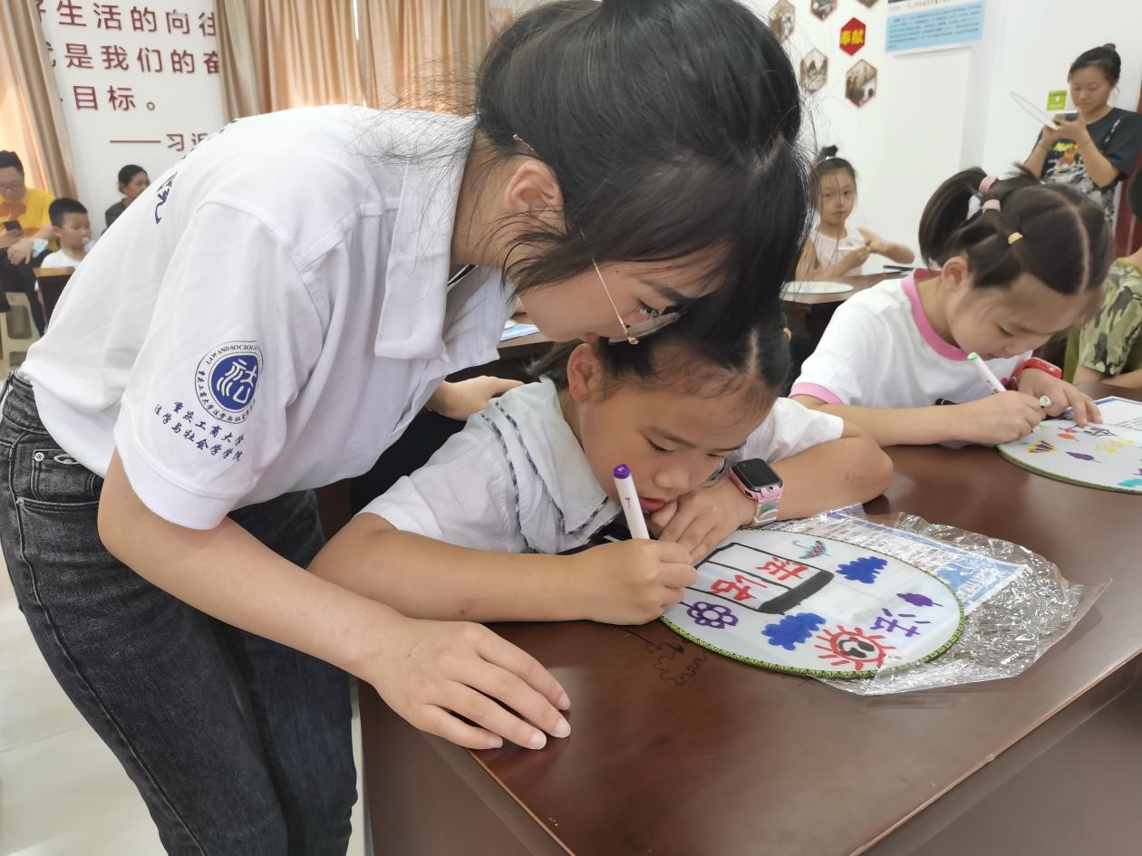 为使少年儿童更好地树立法律意识,增强自我保护观念,推进全面建设社会主义法治国家的进程,7月7日,青年普法志愿者服务队走进沙坪坝区梨树湾社区,向社区儿童宣讲社会主义核心价值观和未成年人自我保护知识。志愿者们深入浅出地引导儿童学习《中华人民共和国未成年人保护法》,以三组生动的情景再现和案例分析告诉孩子们什么可为、什么不可为,引导孩子们懂得尊师重道、团结同学,礼貌待人、乐于助人。志愿者们以近年来校园内频发的暴力行为作引入,教导孩子们在遭遇此类事件时应该如何用法律手段进行自我保护。随后,孩子们在扇子上进行“画法”活动,用画笔描绘出心中的社会主义法治国家。此外,志愿者们还向孩子们宣讲了防范电信诈骗的相关知识,并教会孩子们如何对待陌生来电、危险网站以及预防电信诈骗。通过懂法、画法、守法三个环节的宣讲,让孩子们更好地认识到法律在生活中的作用,学会在遭遇困难时运用法律手段保护自己。