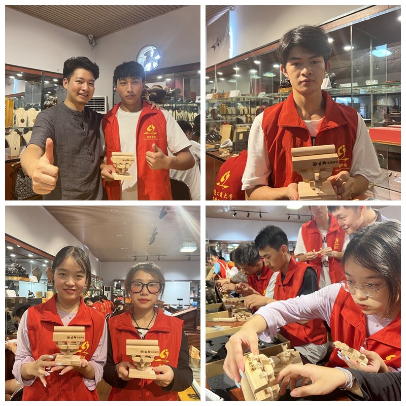 在实践体验基地,传承人周奎向实践团讲解了传统木工工具、榫卯结构工艺和家具制作工艺流程。实践团还亲自体验了斗拱榫卯积木鲁班锁、孔明锁的拆卸与拼装,使大家零距离领略到中国文化木艺之美,探寻传统木艺的精湛技艺,感受“守”艺人精雕细琢的匠心精神。