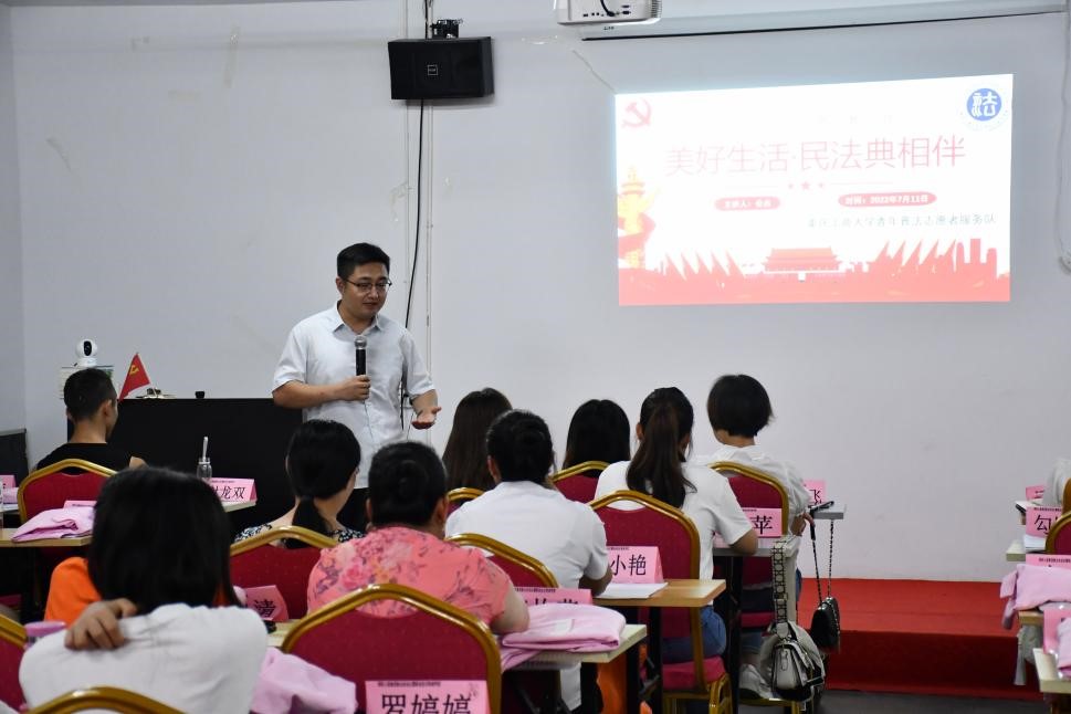 7月12日,青年普法志愿者服务队邀请酉阳县渝鑫律师事务所律师孙伟芹,同三位法学教师一起带队走进酉阳县玉柱社区,面对面地向社区居民进行《民法典》普及和防诈骗宣讲。三位法学专家针对在生活中常见的物权纠纷、继承纠纷、婚姻纠纷等法律问题,以及纠纷解决方案向居民进行了宣讲和解答,同时也在预防养老诈骗方面为群众进行了详细说明和讲解,为居民提供了维护合法权益的法律途径和方法。