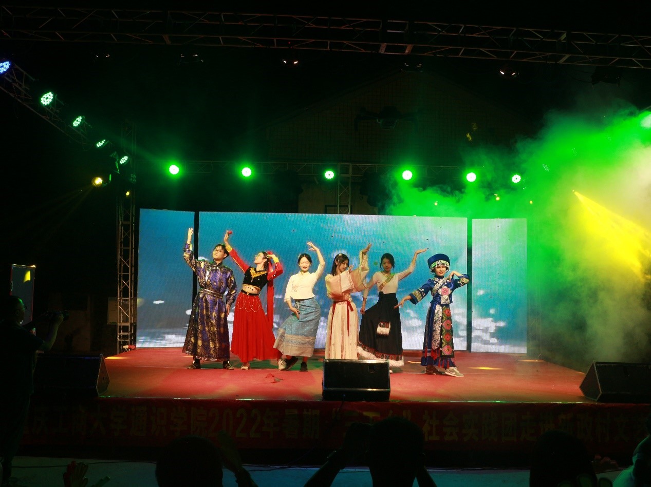 文艺下乡暖民心,乡村振兴正当时。7月16日晚,通识学院“聚焦‘大思政’:铸民族同心,促乡村振兴”民族团结实践团时隔一年后,再次走进重庆市忠县石宝镇新政村,举行“聚乡村振兴向心力,扎民族团结同心圆”主题文艺汇演。通识学院党总支副书记、副院长、江北校区管委会副主任况源,江北校区管委会副主任傅晓燕,通识学院党总支专职组织员宫彪,江北校区管委会副主任、新政村驻村第一书记兼工作队队长赵雄,忠县石宝镇党委书记胡素萍,石宝镇人大主席邓横峰,石宝镇党委副书记周政等石宝镇人民政府领导,新政村、两河村驻村工作队及村委,通识学院综合办、学工办、分团委负责人以及实践团全体成员与当地村民们欢聚一堂,别样的“村晚”大舞台彰显了文艺下乡的独特魅力。