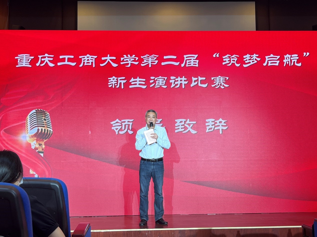 李国军为比赛致辞。他提到,习近平总书记在二十大报告中勉励青年:“青年强,则国家强。当代中国青年生逢其时,施展才干的舞台无比广阔,实现梦想的前景无比光明。”李校长希望广大新生能够响应时代号召,发扬好重庆工商大学“勤学善思,求真笃行”的优良学风,在接下来的大学生涯中将自己对未来的憧憬和誓言落实到各项行动中,勇于迎接挑战,树立远大志向,展现青春风采,与新时代同向同行,贡献青春力量,成为“有理想、敢担当、能吃苦、肯奋斗”的时代新人。