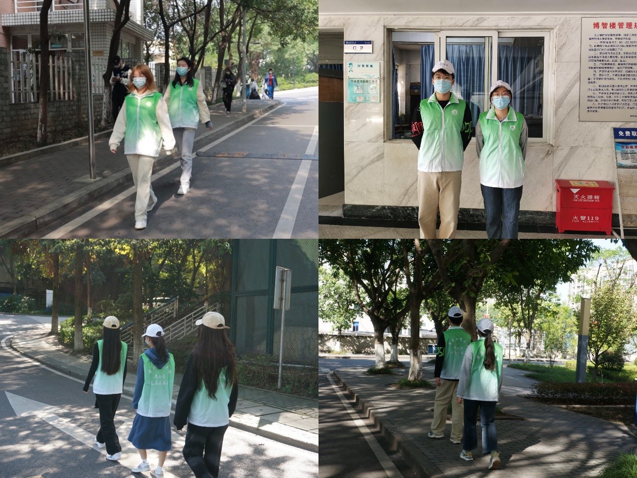 “疫情就是命令,防控就是责任。”志愿者招募令一经发出,同学们纷纷踊跃报名,希望为校园疫情防控、平安守护贡献一份力量。10月19日起,每天早上8点,校园巡逻的志愿者们到指定地点领取“翠小青”志愿者马甲,开始在校园巡逻起来。从南操到南区,从七教到图书馆,从八教到田家炳,从北操到翠湖,4个小分队各司其职,关注校园安全,提醒同学们正确佩戴口罩,减少人员聚集。从早上8点到晚上9点,一共6个班次的轮换,大家都有序交接认真工作,绝不马虎。午餐和晚餐的时间, 筱园、松园、菊园、兰园食堂的大门口和各个楼层,志愿者也陆续到岗,他们拿上喊话器,提醒师生佩戴好口罩,间隔1米,有序取餐。他们精神饱满,热情用心。志愿者们说,我们能做的不多,能做一点算一点,校园需要大家的共同守护。