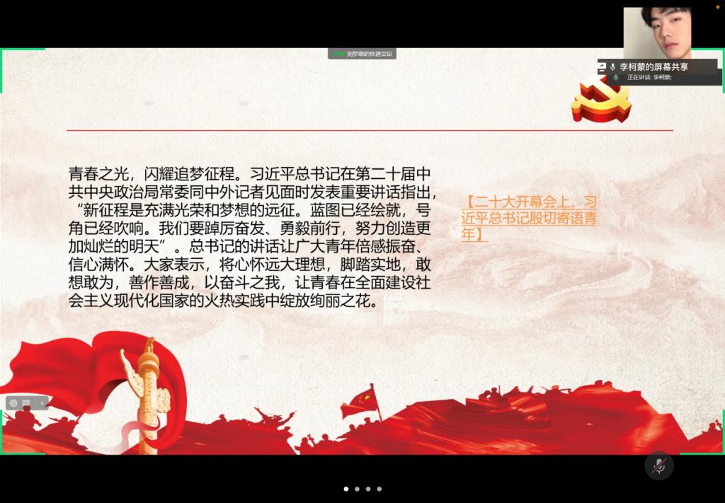 各团支部以报告领学、精神宣讲、心得分享、党史问答、红歌竞猜、“青听青诉-中国故事”分享等多种形式深入引导青年大学生深刻理解党的二十大精神,帮助青年更加深刻领悟“两个确立”的决定性意义,更加紧密地团结在以习近平同志为核心的党中央周围,不断增强“四个意识”、坚定“四个自信”、做到“两个维护”,将党的二十大精神扎实贯彻落实到学习工作中,争做担当民族复兴大任的重工商大学子。