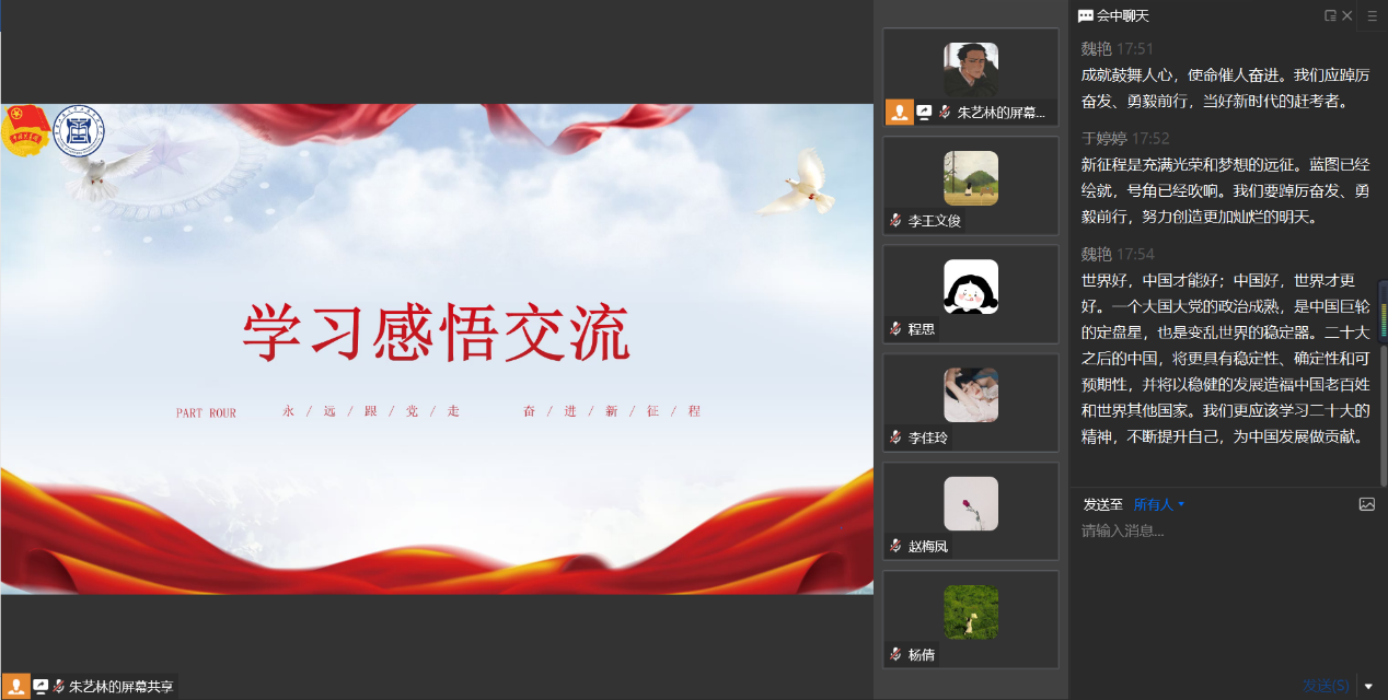 11月18日,工商管理学院在企业微信线上举行“学习宣传贯彻党的二十大精神主题学习会”。工商管理学院全体团干部参与了本次学习会,会议由工商管理学院分团委学生副书记朱艺林同学主持。