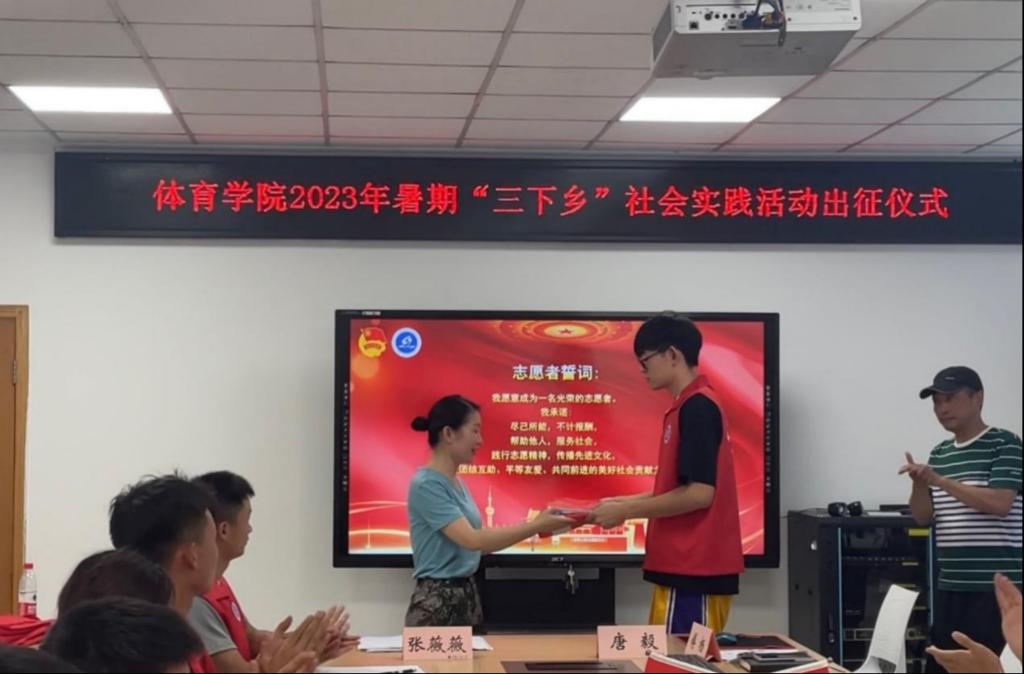 会上,傅杨带领全体实践团成员进行出征宣誓,他们表示,将秉承“守正坚卓,砺学精技”的院训精神,在社会实践中彰显体院人的意志品质,为社会贡献智慧和力量。最后,党总支张薇薇副书记为本次暑期“三下乡”社会实践队伍授旗。