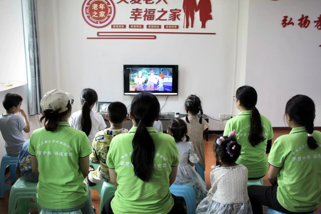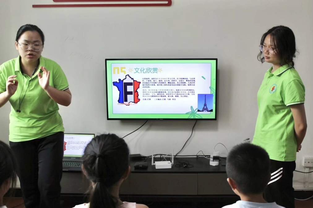 语言媒介搭桥梁,传播中国好声音。在趣味文化分享环节,服务队成员播放了法语电影片段,活动现场,孩子们深深地沉迷于《小王子》孩童的世界,感受到《丁丁历险记》机智勇敢小侦探的魅力,从《基督山伯爵》体会到人性的正义善良。服务队成员谷蕊分享了不同国家的文化,孩子们在服务队的组织带领下,也积极分享了自己熟知的中国与法国的著名建筑,感受文化差异。服务队成员与孩子们一起齐唱国歌,告诉孩子们将中国文化传播出去是新时代青年的使命,也鼓励孩子们积极学习外语,增长语言交流本领。