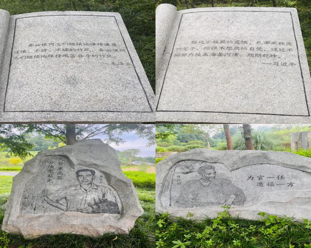 步入“正气之路”,两侧设置有伟人“论正风反腐”要言石书、讲“三命而俯”的正考父、“为官一任,造福一方”的焦裕禄、“大贤秉高鉴,公烛无私光”的周恩来等勤廉故事石雕。一行行遒劲有力的文字,一个个鲜活生动的案例,深深地折射出了中国共产党人的政治意识、公仆情怀、道德品质,给实践团成员带来一场直观而深刻的廉政教育,感受“廉”风劲吹。
