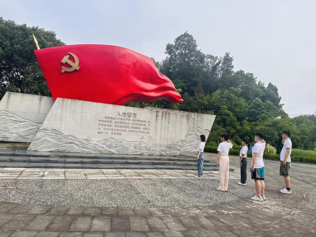 在清风广场,将会看到“五个一”人文景观,包括一面党旗、一块镌刻着“人民对美好生活的向往,就是我们的奋斗目标”置石、一把尺、一杆秤、一面镜,寓意党是核心,为我们各项事业发展指明前进方向,“以人民为中心”是党的初心使命,做人做事要“心中有戒”,百姓心中有杆秤,要随时随地照镜正己。接着实践团成员在正式党员的带领下重温了入党和入团誓词,再一次深切感受到了中国共产党伟大的信仰传承力量。