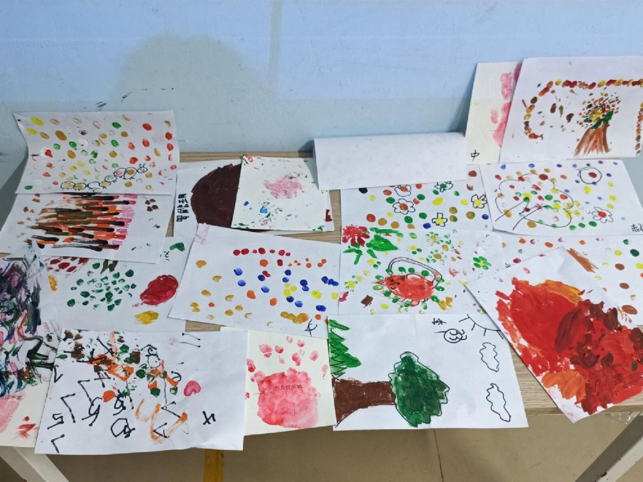 在志愿者结合教学视频详细讲解了手指绘画的方法与技巧之后,活动进入了动手实践环节,志愿者们和启明星机构的老师们一齐围在孩子们的身边进行一对一的帮助,帮助手指发抖的孩子挤颜料、为反应迟缓的孩子一遍遍讲解绘画过程、为孤僻沉静的孩子亲手蘸颜料进行演示。在绘画过程中,志愿者们通过耐心的沟通与帮助,逐渐销去开始的隔阂与陌生,与孩子们建立了融洽的关系,并辅助孩子们完成了一幅幅充满童趣与想象力的绘画作品。