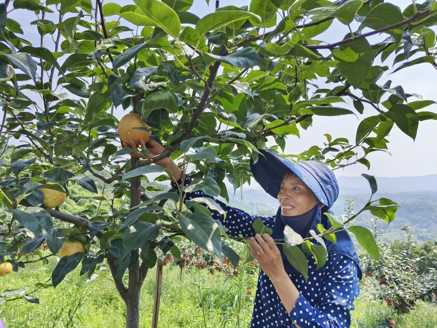 (智囊团成员与阿姨一起摘翠冠梨)