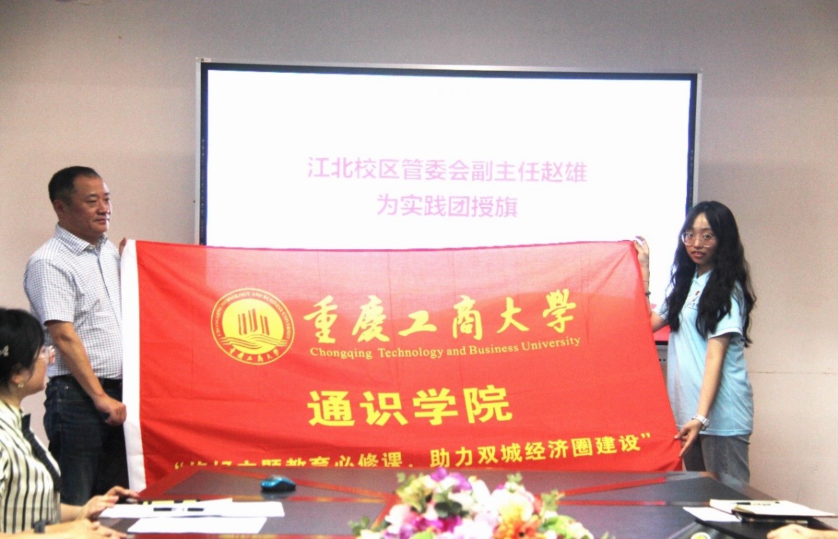 江北校区管委会副主任赵雄讲话并为实践团授旗。他希望实践团成员在此次暑期“三下乡”社会实践活动中做到三心,即:“尽心、全心、真心”,秉承新时代大学生“有理想、敢担当、能吃苦,肯奋斗”的优秀品质,实现“躬耕实践增才干,稼穑青年助振兴”,同时更应明晰“共建‘双城圈’青年勇当先”的责任担当,秉持“一家亲”、立足“一盘棋”,力争在本次实践活动中取得丰硕成果。