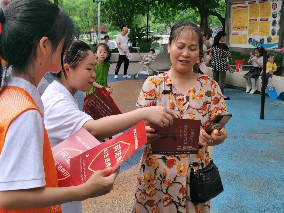 活动现场,大学生志愿者向社区妇女儿童分享《民法典》普法小视频,讲解我国公民在不同年龄段所享有的权利和义务。大学生自编自导自演的普法情景剧“天上掉馅饼”,生动形象地展示了《民法典》在社区高空抛物案件中的运用。表演结束后,小朋友们分享了自己的收获。