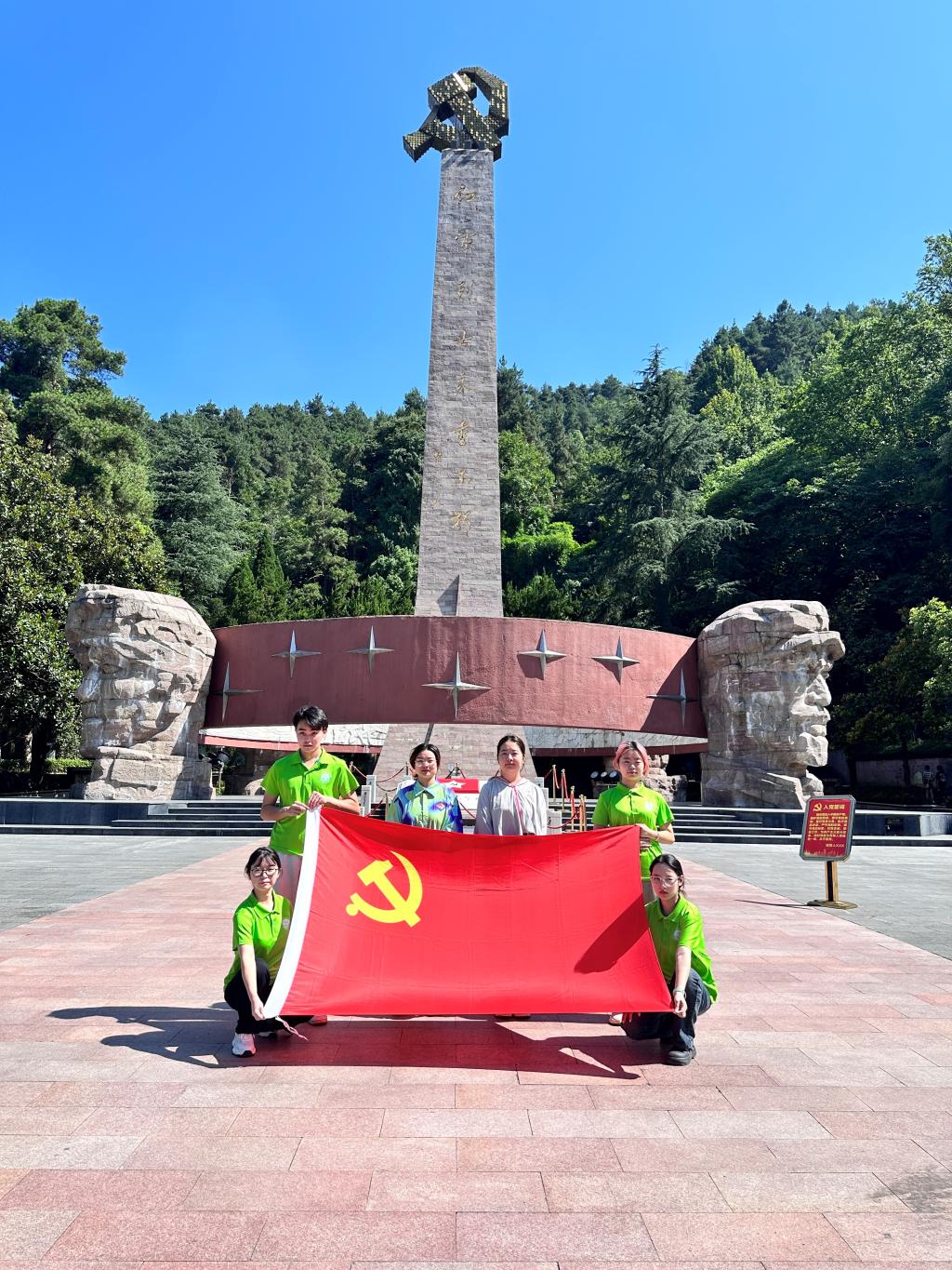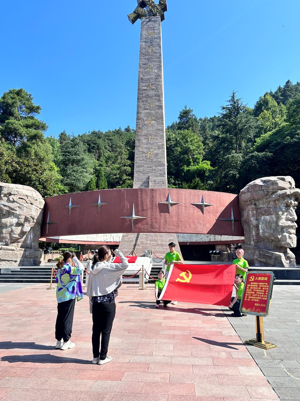 实践团有序列队拉旗,王南妮与余思云2名党员教师在纪念碑前重温入党誓词,面对鲜红的党旗,她们高举右手,郑重宣誓:“我志愿加入中国共产党,拥护党的纲领,遵守党的章程,履行党员义务,执行党的决定,……”。全体成员行鞠躬礼,向长眠于此的先烈们表达最崇高的敬意和深深的怀念。实践团成员纷纷表示,将会以革命先烈为荣,铭记历史,传承红色基因,弘扬红色精神,为实现中华民族伟大复兴的中国梦而奋斗。
