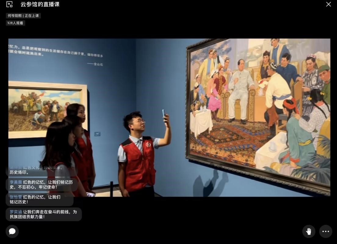 实践团成员立足馆藏实际,以创新展示为出发点,全程采用直播“云参馆”的方式让无法到现场的同学也能“云参观”,感受“近在咫尺”的博物馆景象,走进千里以外的新疆。直播得到同学们的积极响应,观看直播人数累计达500余人,互动留言共计1000余条。实践团成员在参观过程中,将所学所思所感与直播间的同学实时分享互动,一面鉴世、一面润心,与远在千里之外的同学共上一堂别样生动的“云课堂”,进一步增强历史自觉、坚定文化自信,共同感受历史文物的魅力和中华文化的源远流长。