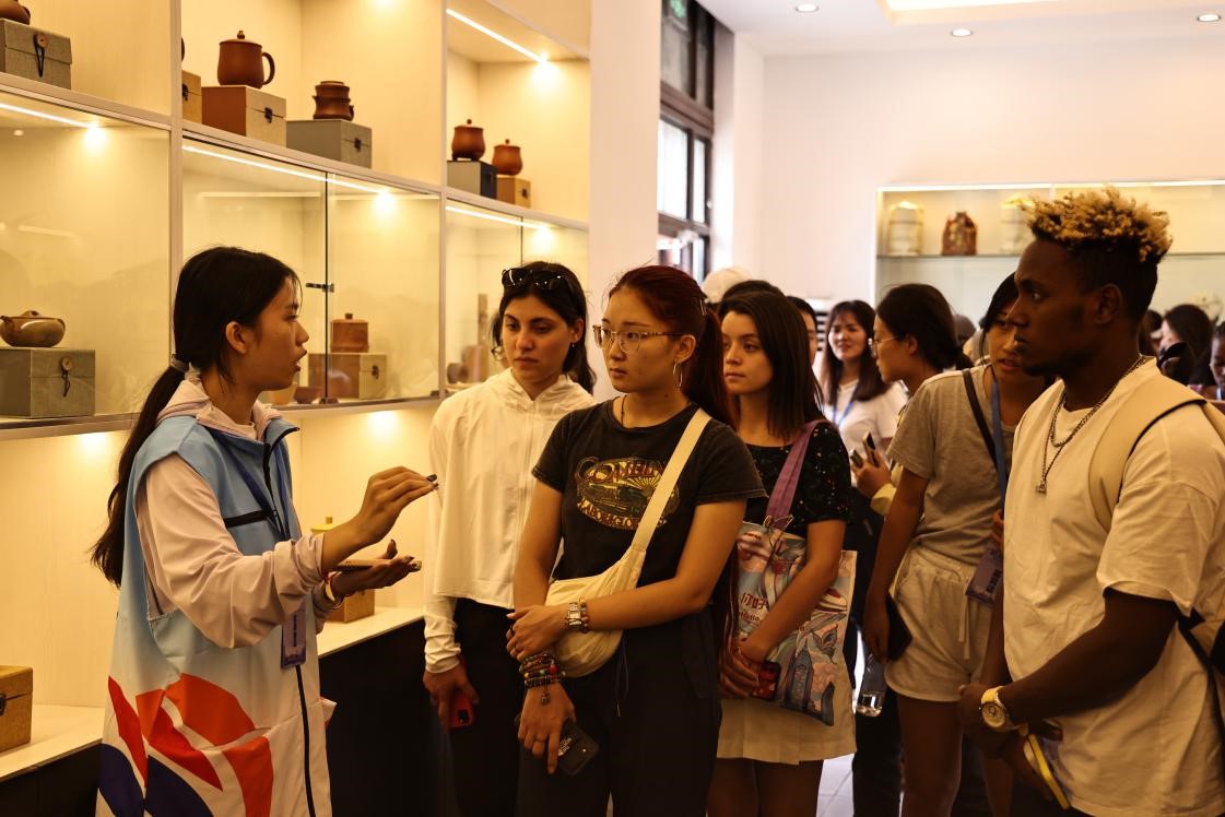 紫砂博物馆内陈列着丰富多样的紫砂制品,这些器物展现了中国传统工艺的精湛和艺术的魅力。实践团成员带领游客游览紫砂博物馆,作为讲解员,详细讲解了每个作品的历史、设计理念和制作工艺,介绍紫砂文化在中国传统文化中的重要地位,在茶文化中的独特作用,紫砂壶的历史渊源和制作技艺,以及紫砂制品的市场情况和收藏价值。他们用精准而生动的语言,为参会嘉宾们呈现一幅幅紫砂艺术的画卷。
