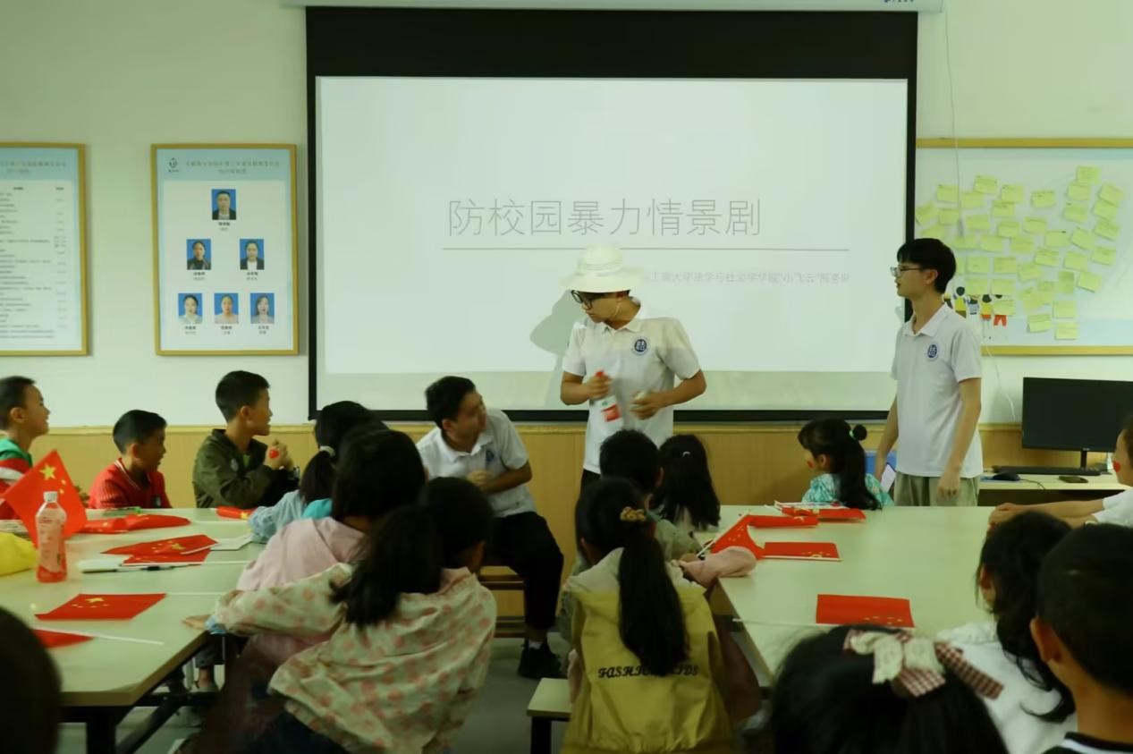 在普法课堂上,服务队为小朋友们带来防范校园暴力和禁毒防艾宣讲,通过情景剧、模拟法庭的演绎,深入浅出地讲解了校园暴力的定义、分类、危害、个人应对校园暴力应采取的措施,讲解了毒品的种类、危害及防范手段等。