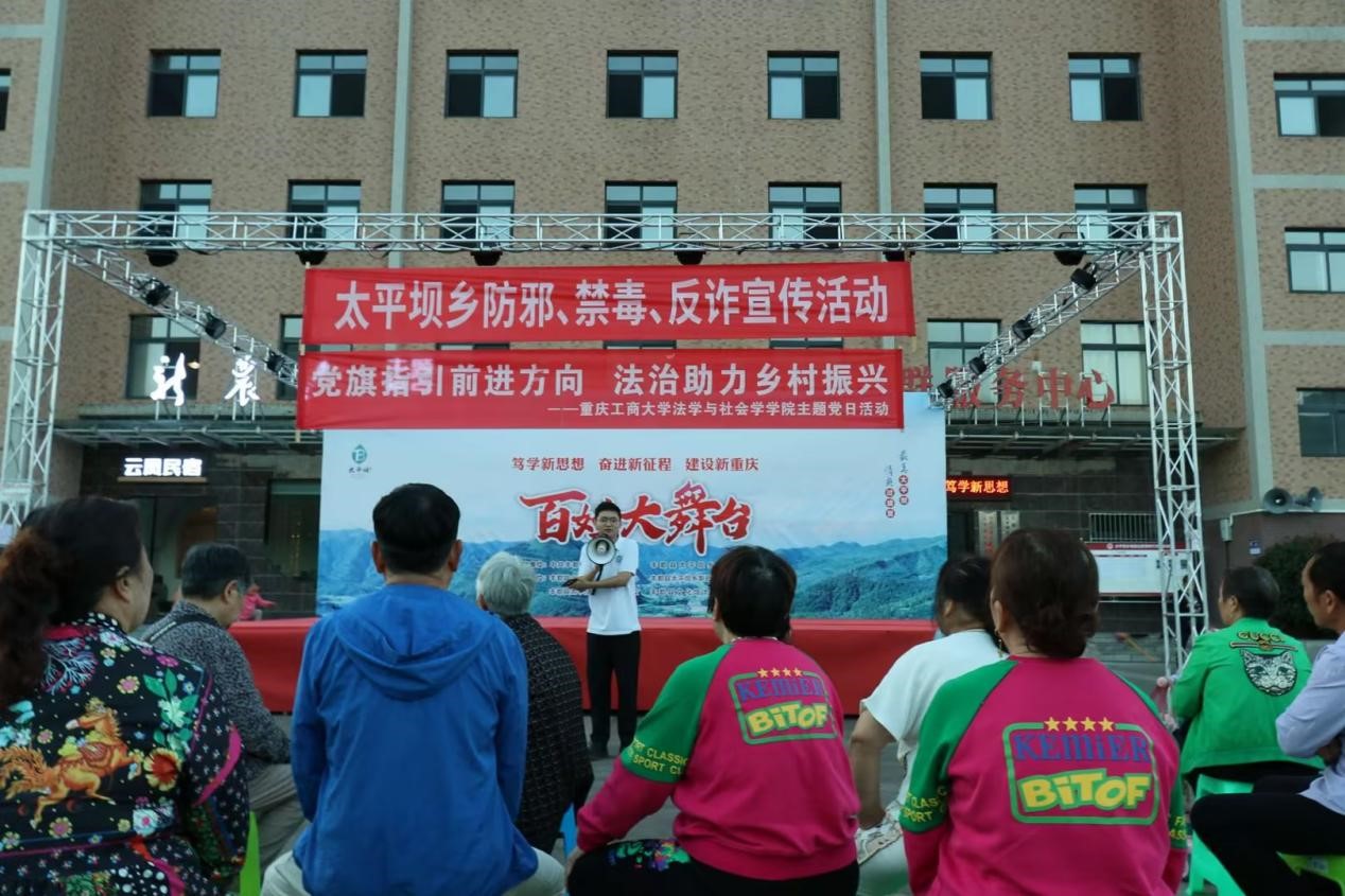 在太平乡政府工作人员的带领下,服务队一行还走访了太平坝乡司法所所长何家伟,了解当地反诈防骗宣传工作开展情况及典型案例。何家伟带领服务队师生在太平乡凤凰社区广场依托“百姓大舞台”开展防范诈骗普法宣讲和小品演出,并设立法律义务咨询点,由法学系主任公杰博士与向往博士为群众提供法律义务咨询。