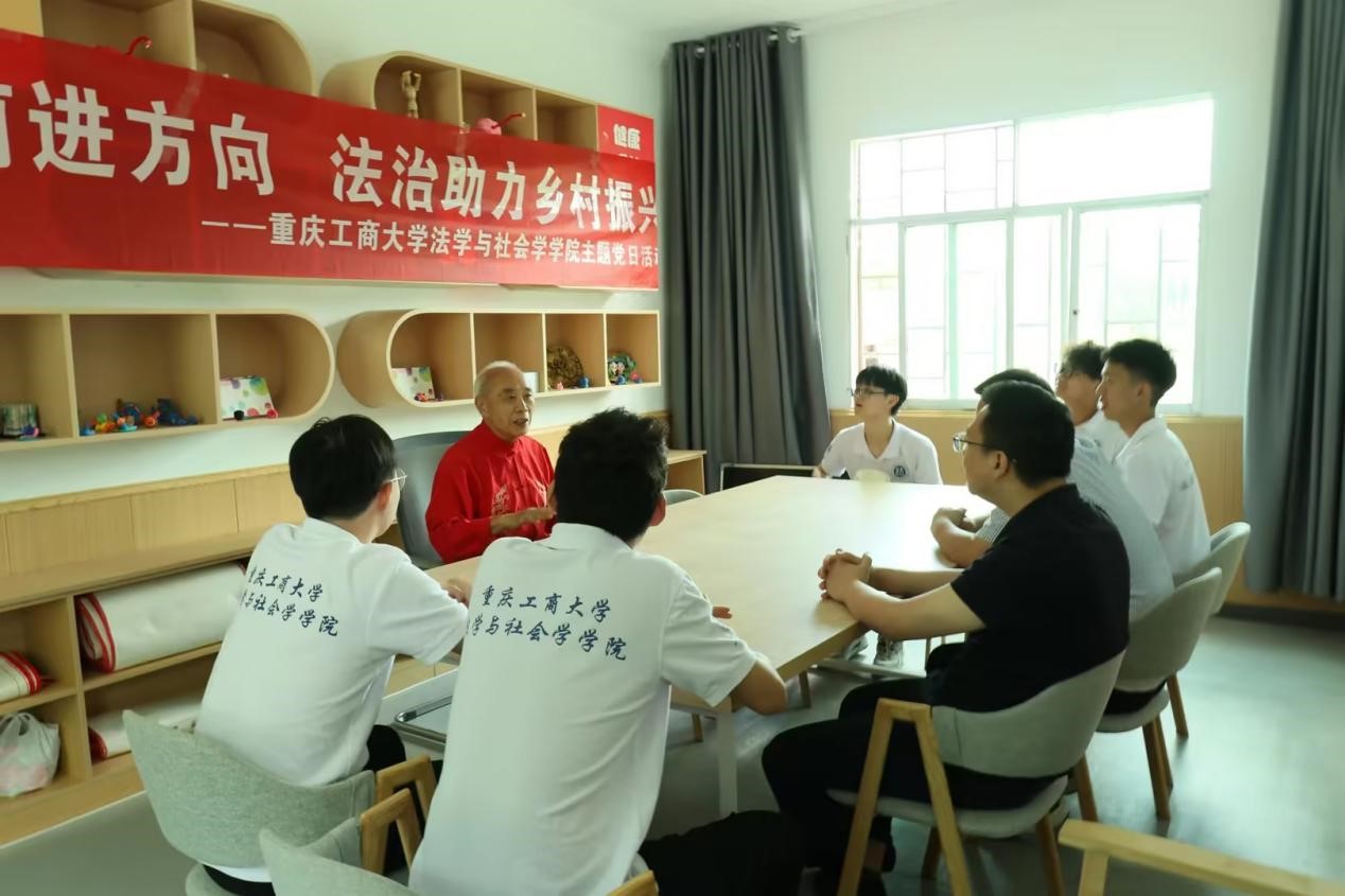 活动结束后,服务队师生在太平乡青少年家庭教育互助会与王爷爷交流座谈,王爷爷作为一名党龄超过60年的老党员,从党员干部的责任担当、自身的奋斗故事、南岸区的革命与发展故事出发向服务队师生做了主题分享。
