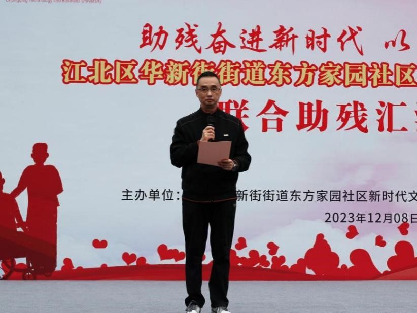 活动中,我校通识学院专职组织员宫彪为此次汇演致辞。宫彪向前来参加此次汇演活动的各位社区居民表示欢迎和感谢,同时介绍我校通识学院过去一年在关爱残疾人方面取得的成绩以及通识学院学生们为此次汇演付出的努力,并预祝本次汇演取得圆满成功。