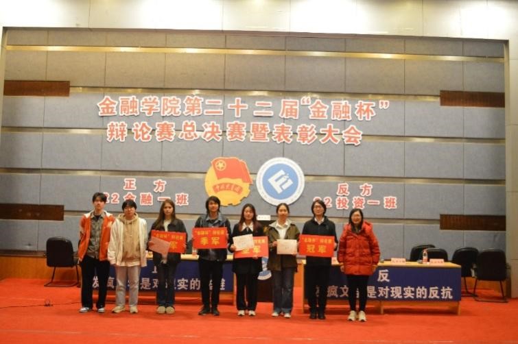 22级金融一班和22级投资一班辩论队围绕辩题“在当代,孔乙己们应该脱下长衫还是穿好长衫”展开激烈辩论。正反方准备充分,双方旁征博引、有来有往,全场气氛热烈。经过激烈角逐,22级投资一班夺得“金融杯”辩论赛冠军。