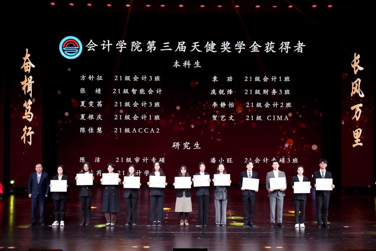 颁奖环节,曾维伦为获得2023年国家级荣誉称号和奖励的老师、团队颁奖;李国军为获得本硕学生国家奖学金的学生颁奖;蒋年韬为获得2023年重庆市级荣誉的老师颁奖;天健会计师(普通合伙人)事务所副总裁、重庆分所总经理龙文虎为获得2023年天健奖教金的老师颁奖;天健会计师(普通合伙人)事务所重庆分所副总经理潘理科为获得2023年天健奖学金的学生颁奖;大信谛威会计师事务所重庆分所所长罗晓龙为获得2023年大信谛威会计之星的学生颁奖。