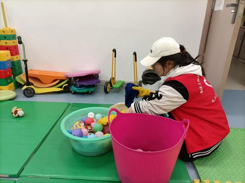 另两批志愿者在“丹佛”儿童康复训练中心和“启明星”儿童基地,对孩子们日常活动的房间进行打扫清洁,将物品收纳整齐,进行了一次全覆盖卫生大扫除,为孩子们的健康成长保驾护航。志愿者们认真细致的服务精神让孩子们感受到了温暖,得到了基地老师的一致认可。
