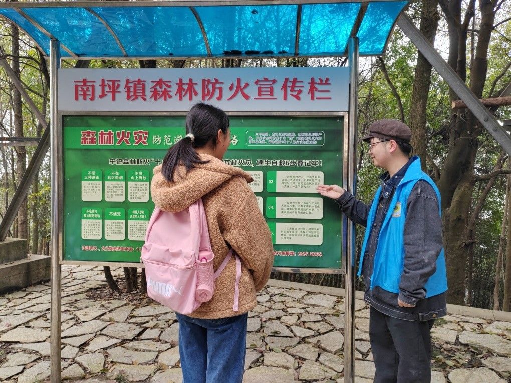 上午九点十分,志愿者们轻装上阵,在南岸校区校前广场集合,活动负责人为每位志愿者分发了一只塑料袋,随后大家便向南山书院进发。九时四十分,踏上了登山的阶梯。一路上春叶萌动,雾气飘渺,尽管山路蜿蜒陡峭,志愿者们仍热情洋溢,充满活力,相互搀扶,秩序井然,蓝色马甲与青葱绿叶相映生辉。石板路旁,时有空水瓶、旧纸巾、食品包装袋等、垃圾散落,破坏着龙脊山如画的美景。为了守护龙脊山的洁净,志愿者们遇到垃圾便弯腰俯身,将其拾起放进袋中。每到一处休息平台,志愿者们还会热情地向来往的登山者们宣传和普及森林防火,环保登山的小知识,将严禁森林用火,保护自然铭记于心。