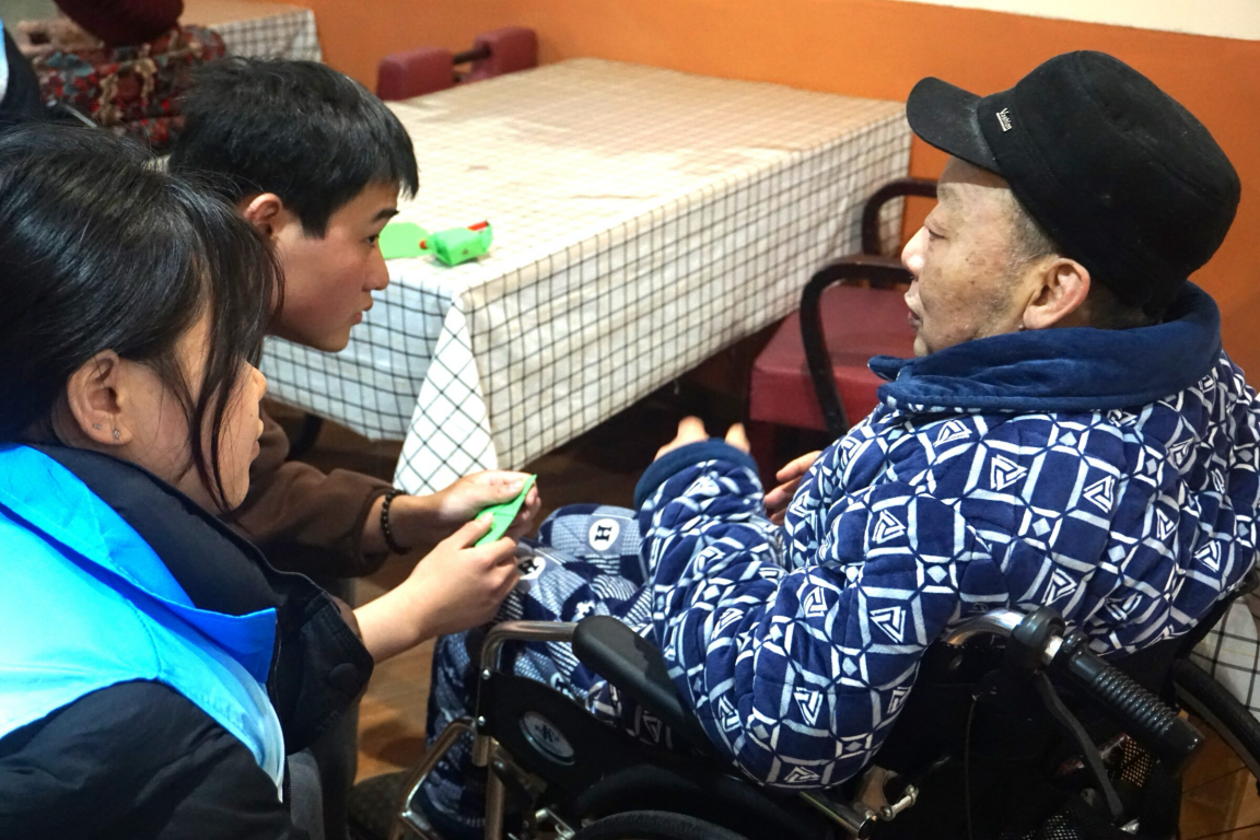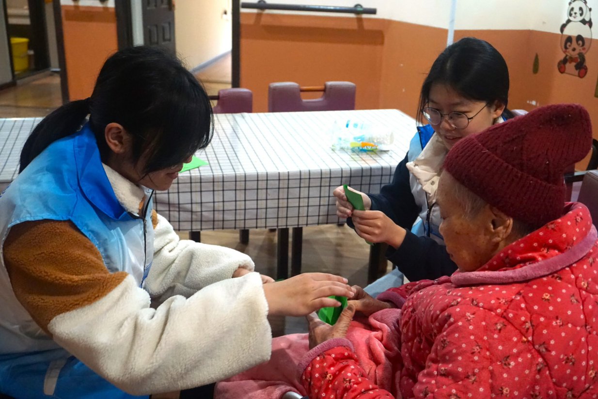 在养老院,志愿者们将牛奶等慰问品交予养老院的工作人员,以小组为单位,陪伴老人。志愿者们一边与老人们一起折纸雷锋帽,一边与老人聊着天,听老人们讲述属于他们的青春岁月和辉煌过往。讲述过程中,志愿者们认真倾听,向老人们提出自己的疑问,老人们也耐心地为志愿者们讲解他们真实经历过的历史。通过这些故事,志愿者们加深了对老一辈工作者的敬意,心生感慨,收获颇多。