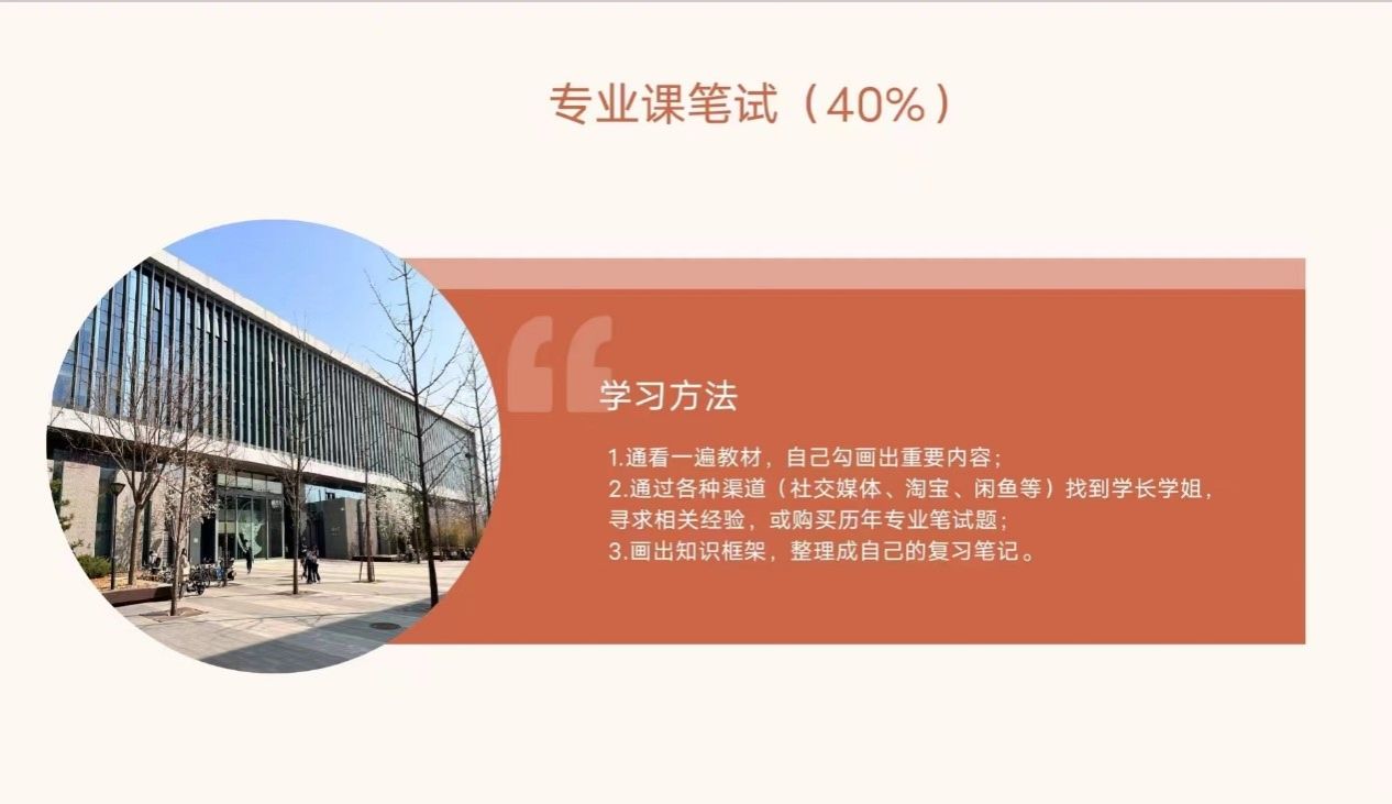 李亮讲述专业课笔试的学习方法和面试的占比和流程。他讲到在准备笔试时,应当通看一遍教材,自己勾画出重要内容。同时可以通过各种渠道找到学长学姐,寻求相关经验,或购买历年专业笔试题。最后,画出知识框架,整理成自己的复习笔记。面试方面,李亮学长则主要介绍了面试的具体流程和事项。