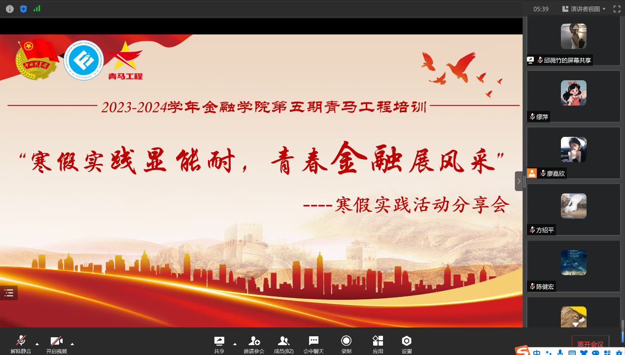 为展示金融学子2024年寒假社会实践风采,引导金融学子通过社会实践深入学习党的二十大精神,正确把握前进方向,3月13日,金融学院以“寒假实践显能耐,青春金融展风采”为主题的第五期青马工程培训在企业微信线上举行。本次培训邀请寒假社会实践优秀学子22级金融工程专业学生邱薇竹、22级金融学院专业学生冷俊锐进行实践经验分享,会议由22级金融学院专业学生廖嘉欣主持。