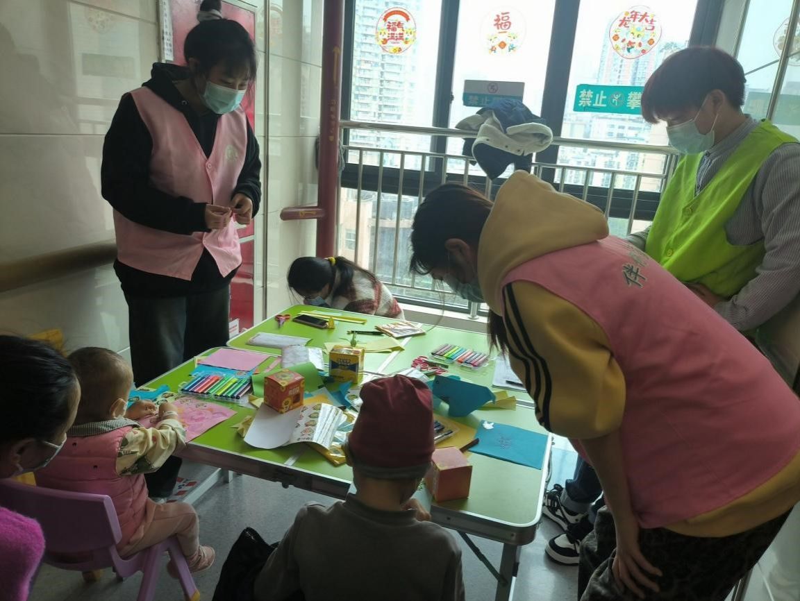 在“奇恩”少儿基地,志愿者们与工作人员一起前往重庆医科大学附属医院儿童医院(渝中区本部)血液科,组织孩子们参加绘画剪纸活动。志愿者们耐心鼓励孩子们踊跃参与活动,耐心细致地为患儿们讲解剪纸技巧,激发他们天马行空的想象力,志愿者们还鼓励孩子们勇敢地讲述作品含义,为他们战胜病魔注入勇气。看着孩子们露出天真无邪的笑容,志愿者们由衷地感到高兴,也更加深刻地明白了“用爱筑高墙,风雨不相离”的志愿者服务理念。
