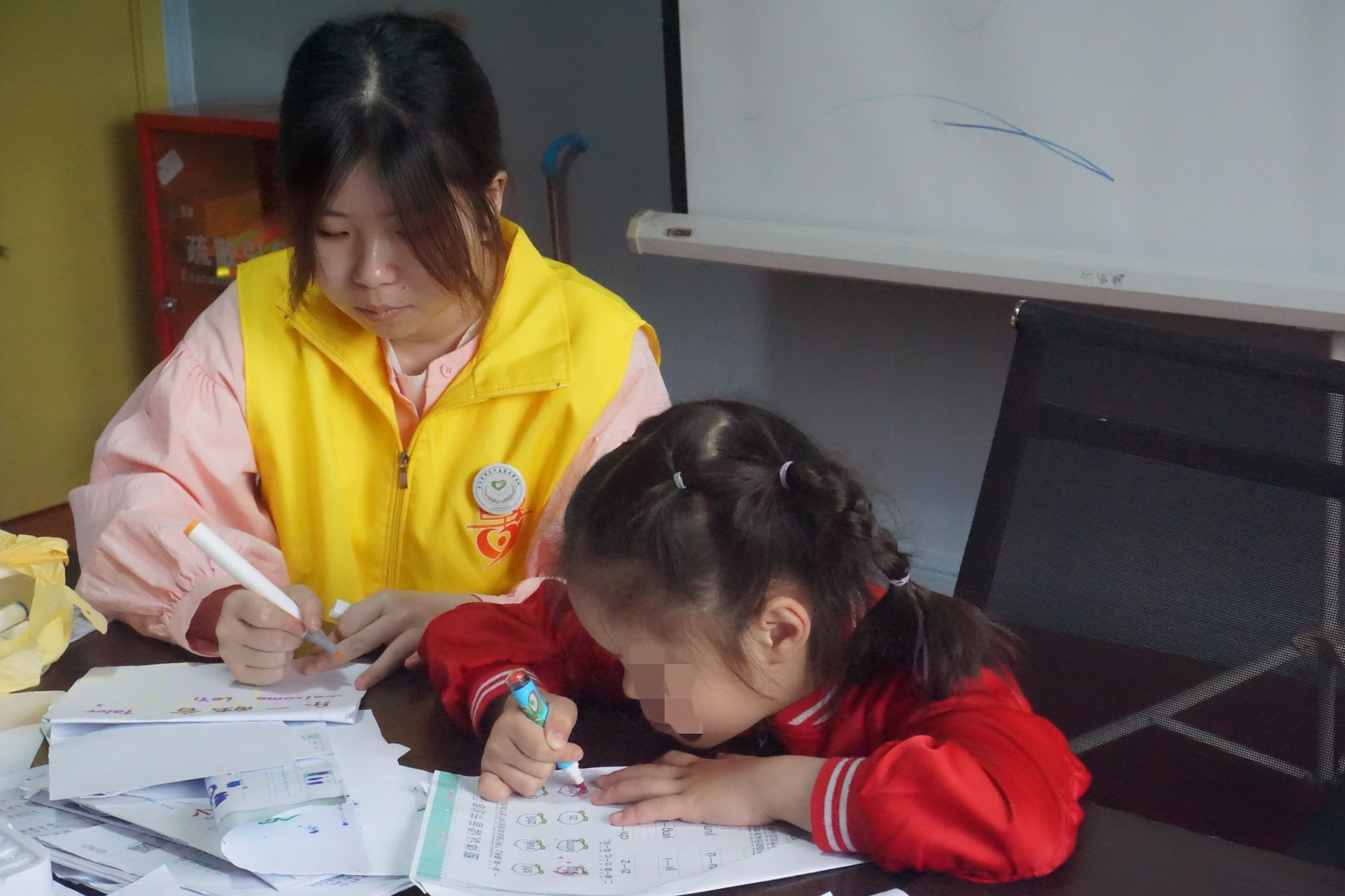 活动中,志愿者们分别带领大、小班的孩子进行早间学习与身体锻炼。在志愿者一对一的耐心辅导下,自闭症儿童有效地进行了识字、读诗、画画、看图识物等多项知识的学习,在互动过程中,他们积极鼓励孩子们参与到各项体育运动中来,培养了孩子们的学习能力与兴趣爱好的同时也提高了自身身体素质。同时,志愿者积极协助食堂工作者,帮忙收拾、洗碗。午休后,志愿者帮助孩子们叠被子,辅助他们穿衣、穿鞋以锻炼其生活自主能力。