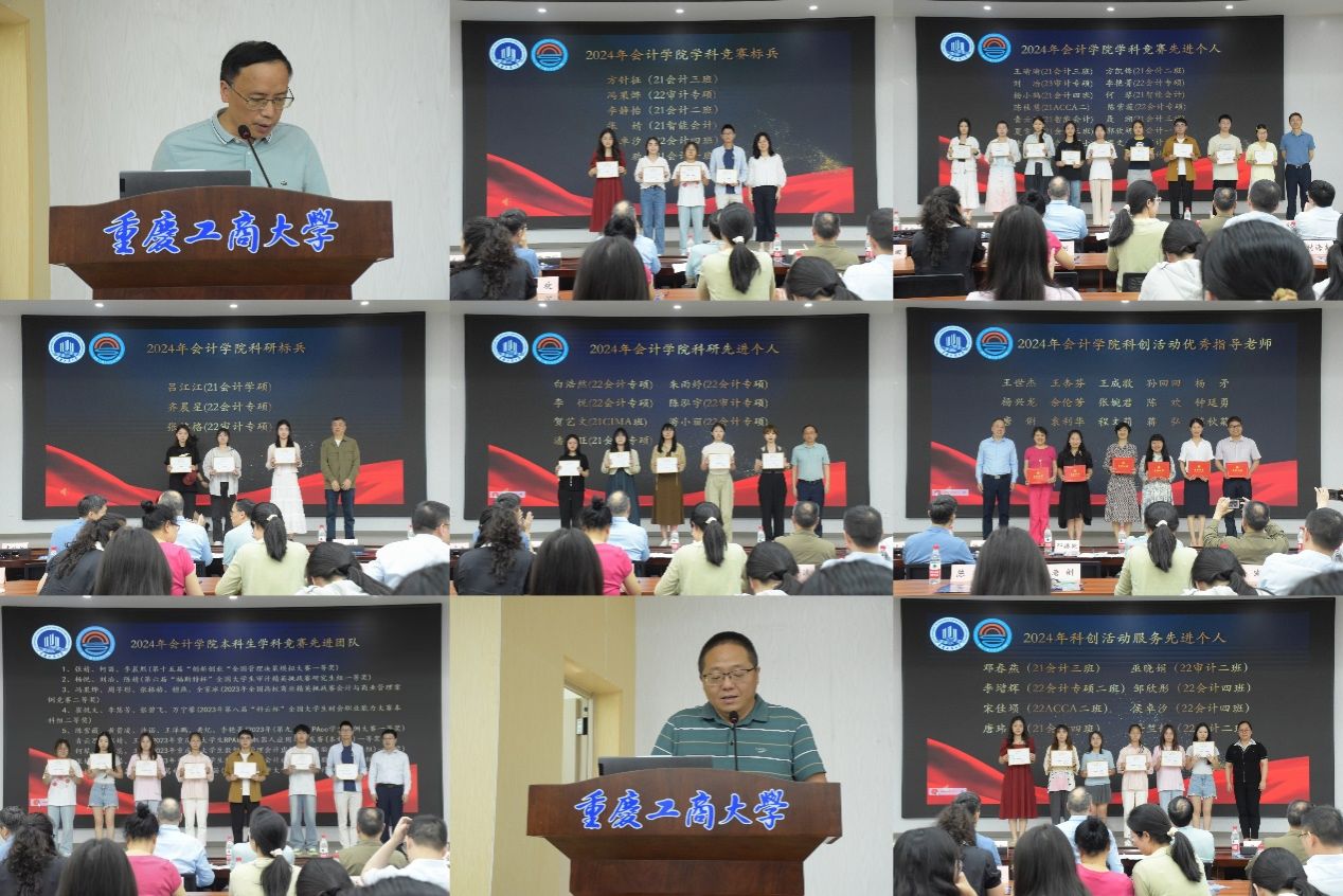 随后,尹建平宣读《会计学院2024年“学科竞赛标兵及先进个人”“科研标兵及先进个人”“学科竞赛先进团队”“科创活动优秀指导老师”的表彰决定》。彭文涛宣读《会计学院分团委关于表彰2024年科创活动服务先进个人的决定》。颁奖环节,与会领导为获表彰的师生集体和个人颁奖。