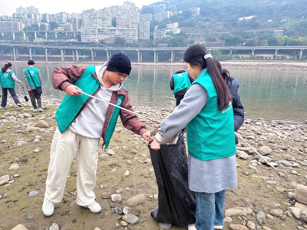 活动准备阶段,志愿者们在规定地点集结完毕,分发环卫夹、垃圾袋、手套等物资,一同前往长江北滨一路开始巡河清理工作。活动开展期间,志愿者们分成几组,协同进行垃圾清理。志愿者们捡拾塑料瓶、食品包装袋、烟头等垃圾,分工协作,相互配合,展现了当代青年巡河护江的热情,参与生态环保的积极性。最后,志愿者对垃圾进行分拣收集并集中处理,共同维护美丽绿色的江畔环境。