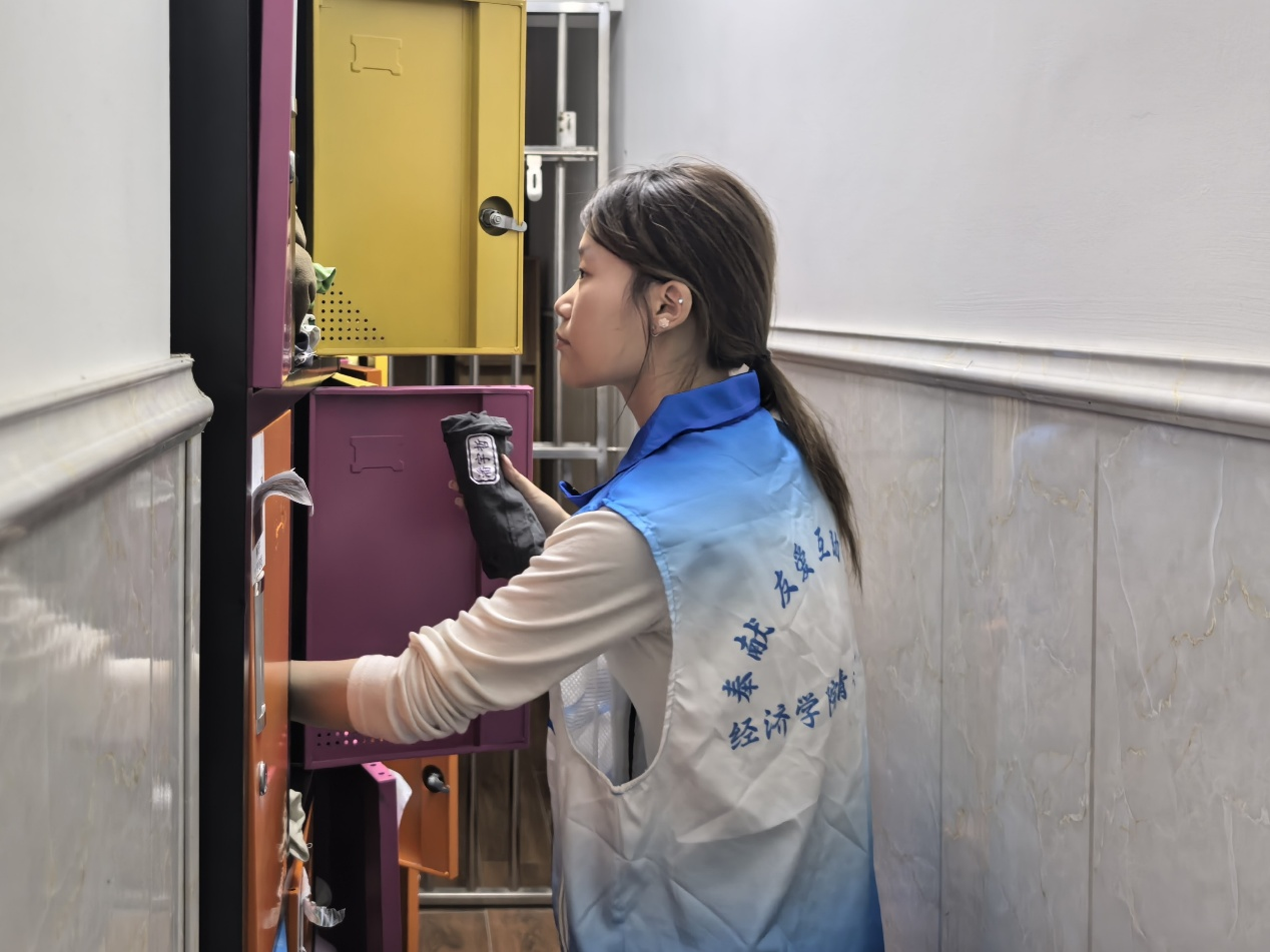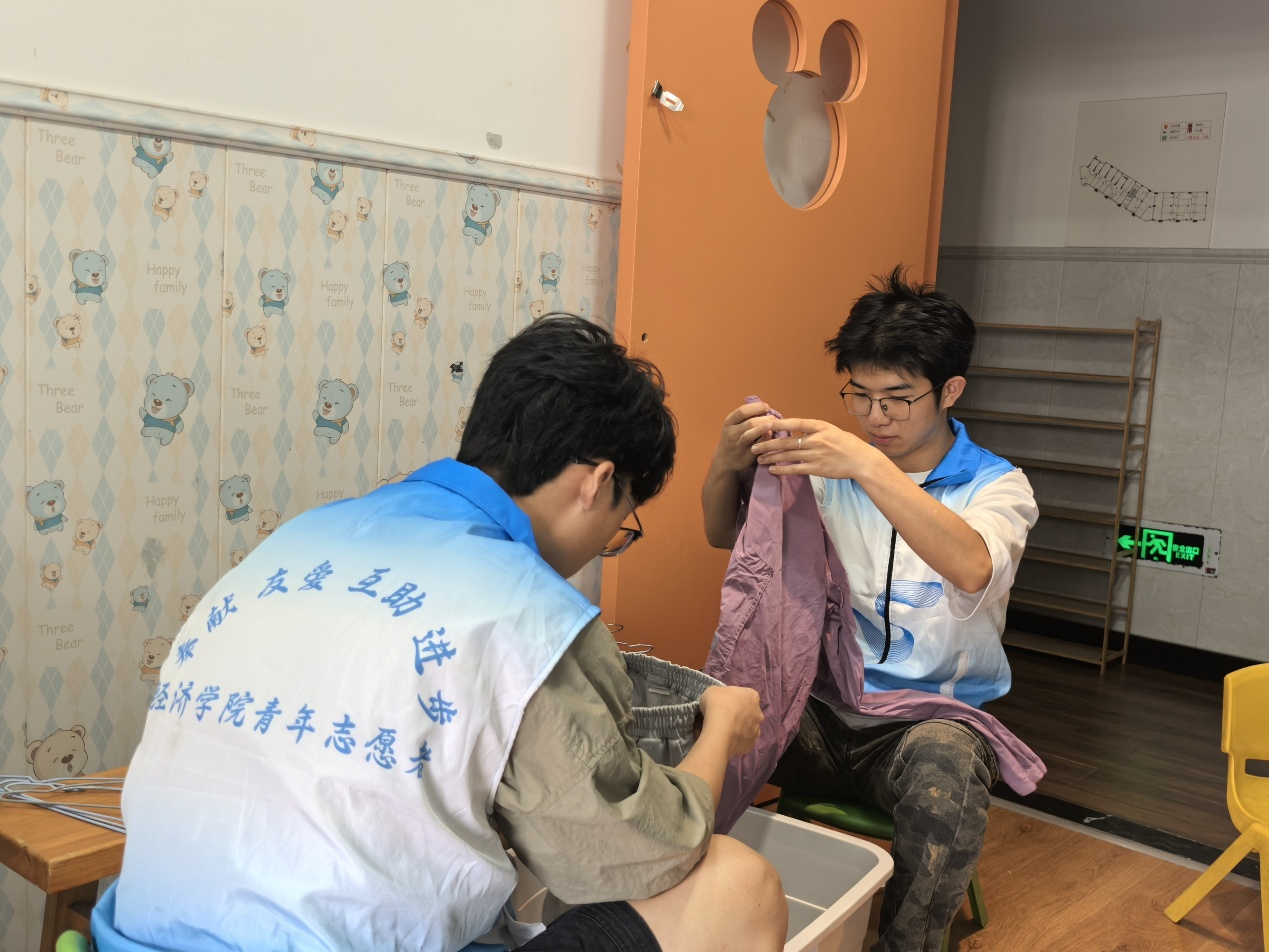 活动中,志愿者主要对幼儿园洗衣楼和生活区两个地方的衣物进行分类整理。志愿者听从工作人员安排将晾干的衣服取下并整齐折叠,放回对应孩子的衣柜,通过实际的行为引导孩子养成“归位”习惯。不仅为自闭症儿童营造出一个整洁有序的衣物存放环境,还拉近了与自闭症儿童的距离。