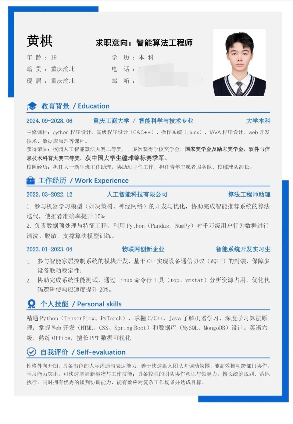 经老师评选,最终在众多作品中敲定了3份优秀作品。三份简历均结合专业明确求职方向,兼具高含金量竞赛、实习经历且成果量化,核心技能贴合岗位需求并搭配综合素养,体现出“专业-目标-能力”的精准匹配。这些获奖作品不仅信息架构清晰、重点突出,更在细节处体现出对目标岗位的精准理解,为其他同学提供了优质参考范例。