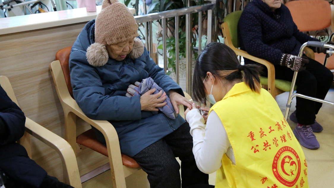 活动当日,志愿者们在学校西门准时集合出发。抵达养老机构后,负责人提前与机构管理员沟通,引导志愿者分散到不同楼层,避免聚集拥挤。活动之初,有的志愿者柔声询问老人是否需要修剪指甲和头发;有的搬来椅子,坐在老人身边耐心唠家常、听老人分享往事,用陪伴驱散孤独;还有志愿者主动协助布置游戏场地、整理活动物料,为后续集体互动做足准备。经过老人同意后,志愿者们蹲在老人身边,细心修剪指甲、剪理头发,用温柔与耐心抚平岁月留下的痕迹,活动室里满是温馨交流的声音。