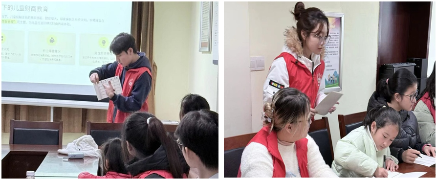 本次活动以“梦想储蓄存根”手工制作为开端。志愿者指导孩子们折叠卡纸、绘制收支表并装饰封面,在实践中理解储蓄的意义,建立基础的财商概念。通过模拟购物、劳动等生活情境,“星火”志愿者们引导孩子们使用自制的“存折”,按照“蓝笔入、红笔出”的趣味规则,沉浸式体验记账与规划。现场还设置了诵读财商口诀和心得分享环节。在志愿者的细致辅导下,孩子们逐步掌握了记账方法,理性消费意识也悄然萌芽。