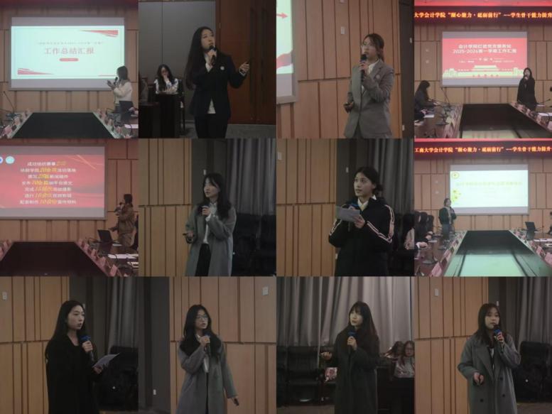 宣讲环节结束后,“砥砺前行·骨干风采”学生骨干述职环节随即展开。会计学院分团委、学生会及各学生组织骨干依次上台,围绕思想引领、活动组织、学风建设、权益服务等重点工作,系统汇报了近期履职情况和成效,同时客观剖析存在的问题与不足,并明确了下一步的发展方向与改进计划。
