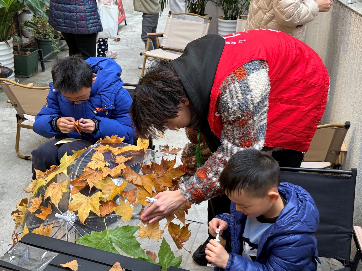 在手工制作现场,志愿者指导孩子们将落叶粘贴在透明雨伞上,孩子们充分发挥想象力,认真裁剪、精心布局,一把把承载着环保理念的“落叶伞”应运而生。