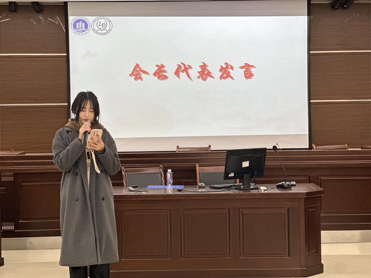 主持人介绍大会流程后,全场一同观看了学期回顾视频,其中生动呈现了律动青年法学社本学期组织的学习研讨、普法宣传与社会实践等活动场景。律动青年法学社会长代表韩依轩、部长代表郑俏俏与干事代表赵煜婷依次上台发言,他们立足社团整体规划,结合个人成长经历进行总结和感悟分享,并对未来发展提出展望与建议。随后开展的“词语接龙”“数字成团”等互动游戏,进一步活跃了现场氛围,展现出社团团结活泼、积极向上的精神风貌。