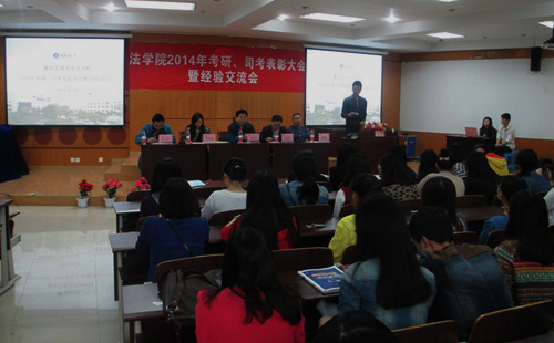 在经验交流环节,法学院指导老师刘波任作了经验分享发言,他着力强调同学们要多与成功学长们交流,学习他们的经验,吸取他们的教训。随后,2014年研究生入学考试、全国司法考试先进个人陈茜、向勇、蒋柳等先后分享各自的考试经验。