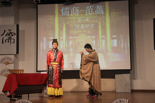 团日活动以传承儒家文化为核心,分“幼时启蒙”、“少年求学”、“经商之路”、“问道儒商”四个篇章进行。气势恢弘的师生齐诵《弟子规》,嗓音清脆交错的古筝演奏《在水一方》,刚劲有力的武术表演,令人回味无穷;话剧《范蠡经商》带领大家重回春秋年代,再现“经商之路”的坎坷;接踵而来的《惊鸿舞》凭姿态柔美,令人沉醉在传统文化的无穷魅力中。最终,团日活动在观众们与会师生庄严的团歌声中落下帷幕。